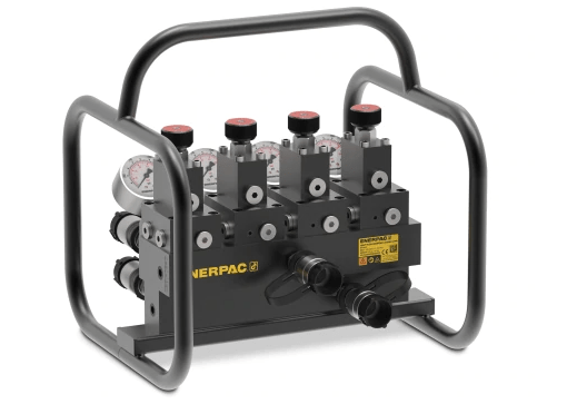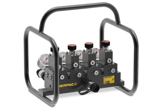 Les manifolds à débits séparés de la série SFM sont la jonction entre les manifolds simples et les systèmes de pompes à débits séparés. Ils permettent de contrôler plus facilement et plus précisément les différents points de levage que les manifolds de la série AM, sans devoir investir dans les systèmes de pompes à débits séparés, plus coûteux. Deux manifolds sont disponibles : le modèle SFM41 pour les vérins à simple effet et le modèle SFM42 pour les vérins à double effet. Pour les projets nécessitant plus de quatre points de levage, vous pouvez ajouter des manifolds SFM supplémentaires à la pompe de manière à permettre le fonctionnement simultané de 8, 12 ou 16 vérins.